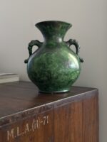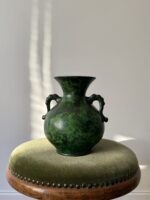 A highly artistic green glaze ceramic vase by Nittsjö Sweden. Featuring stunning architectual grips. Produced in Sweden circa 1940s.